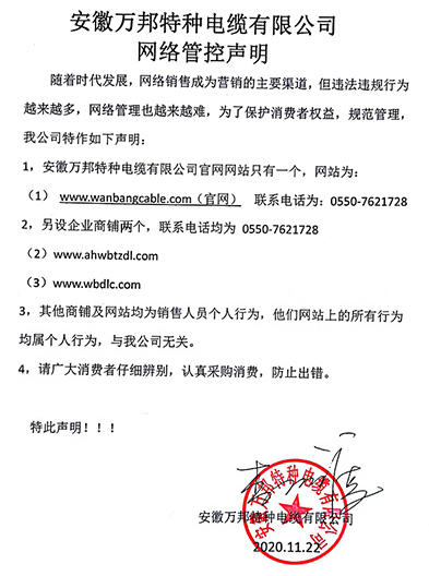 鄭重聲明:安徽萬邦特種電纜有限公司官方網站為:www_wanbangcable_com.hbhsyl.com,除此之外無任何子網站或合作網站,其余均為假冒偽劣。電話:0550-7621728 13485756353 地 址:安徽省天長市滁州高新技術產業開發區經四路29號